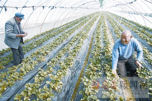 近年來,新蔡縣關津鄉緊緊抓住毗鄰城區、交通便利的有利條件,引導群眾大力發展優質草莓種植,走出了一條發展地方經濟和農民致富的新路。目前,該鄉高灣村已形成規模種植,建成了60多畝草莓種植區,僅此一項每年就可為當地群眾帶來200多萬元的收入。圖為該鄉高灣村草莓種植戶正在大棚查看草莓坐果情況。記者 王 朝 攝