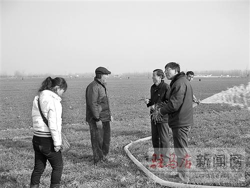 市農科院副院長、農學博士孟祥鋒(右二),帶領國家小麥產業技術體系駐馬店綜合試驗站站長朱統泉(右一)等專家深入我市高產示范基地,指導以抗旱澆麥為主要內容的春季麥田管理。記者 張 靜 攝