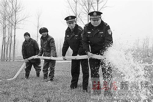 在當前旱情十分嚴重的情況下,西平縣公安局組織民警把幫助困難群眾抗旱澆麥當作開門評警的首責。圖為當地派出所的民警正在幫助群眾澆地。通訊員 楊德清 攝