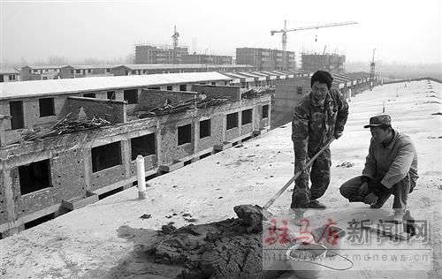 摘要: 確山縣三里河鄉尚莊新型農村住宅社區工程于2010年3月開工建設,該工程總投資2億元,占地520畝,建成后可入住農戶440戶,計劃于今年年底前完成搬遷入住。圖為工人正在屋頂施工。 記者 王 朝 攝