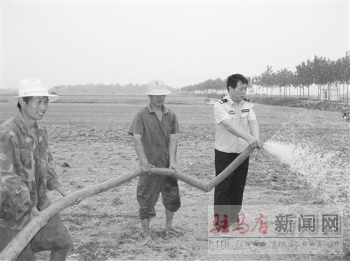 圖為近日正陽縣公安局油坊店派出所民警幫助轄區群眾在播種后的花生地里抗旱澆水。 通訊員 辛朝陽 攝