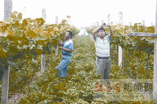 大棚蔬菜種植示范園是驛城區(qū)諸市鄉(xiāng)2010年招商引資項(xiàng)目。該項(xiàng)目由駐馬店市天順生態(tài)種植有限公司投資興建,項(xiàng)目分兩期實(shí)施,一期總投資1200萬(wàn)元,其中固定資產(chǎn)投資1000萬(wàn)元,項(xiàng)目占地280畝,規(guī)劃建設(shè)大棚蔬菜80畝、露天蔬菜200畝,打機(jī)井8眼;二期計(jì)劃投資1500萬(wàn)元,主要用于擴(kuò)建蔬菜種植300畝,并打造集生態(tài)旅游、度假休閑為一體的現(xiàn)代化生態(tài)農(nóng)莊。項(xiàng)目建成后將實(shí)現(xiàn)年銷售收入140萬(wàn)元,蔬菜常年供應(yīng)駐馬店市區(qū)及周邊地區(qū)。圖為管理人員在葡萄園中修剪枝丫。記者 王 朝 攝