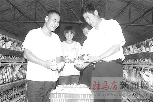 正陽縣呂河鄉農民劉銳領去年貸款20多萬元建成一座占地20多畝的養雞場,當年雞場收入就有20多萬元,還安排當地農民20多人就業。圖為劉銳領和員工在喜收雞蛋。 記者 王 朝 通訊員 麻 斌 攝影報道