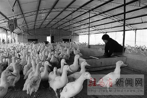 該小區采用村投資建基礎設施、農戶租賃飼養、合作社經營管理的方式。預計年出欄量可達25萬只,年純利潤可達50萬元。圖為養殖戶正在定時定量喂即將出欄的肉鴨。 記者 王 朝 攝