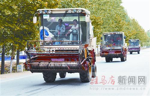 昨日上午,開封市的劉斌和同伴開著聯合收割機正駛向他們的目的地——泌陽縣沙河店鄉。在以后的一段時間里,他們將參與我市的麥收大會戰。晚報記者 劉永奇/攝