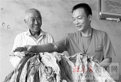 在“百人聯千人、千人進萬家”活動中,遂平縣煙草分公司玉山煙站工作人員魏獻中與煙農姜發亮結成幫扶對子,使姜發亮110煙葉實現了好收成。圖為日前姜發亮在煙站交售煙葉時向魏獻中展示自己的優質煙葉。記者 唐