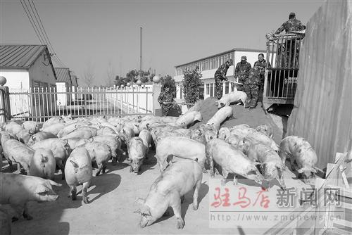 近日,記者在遂平縣文城鄉(xiāng)官莊村拐莊南鑫旺源養(yǎng)殖有限公司場(chǎng)區(qū)看到,一排排豬舍全部配上超聲波霧化消毒室。該養(yǎng)殖場(chǎng)種豬存欄3000多頭,年可出欄生豬40000頭,凈收入700多萬(wàn)元。圖為養(yǎng)殖場(chǎng)剛到一批種豬。 記者 郭連山 攝