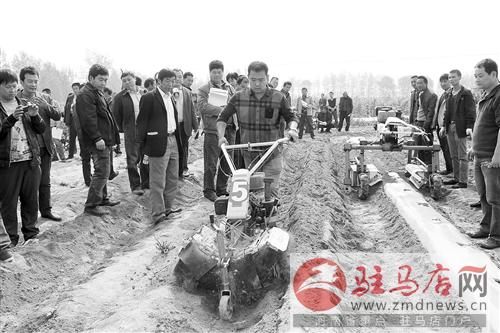 日前,市煙草公司在遂平縣玉山鎮火龍廟村舉行煙用機械使用現場展示會,來自山東青州、福建永順、洛陽一拖等7家49套煙用機械一展風采。圖為廠方代表演示自動煙葉育苗播種機的操作。記者 唐