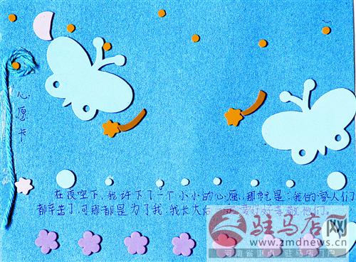 摘要: 小小心愿卡 我希望有一輛自行車。第二實驗小學四(3)班 付詩桃(小記者證號:142826) 在夜空下,我許下了一個小小的心愿,那就是:我的家人為了我都辛苦了,我長大后,一定要好好孝敬他們。第二實驗小學四
