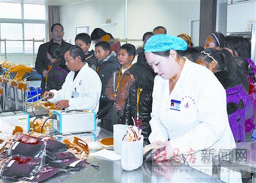 在成分科,小記者們看到了分離前和分離后的血液。“血液分離完了為什么顏色會不一樣?”小記者們的問題依舊層出不窮。“那是因為分離后的血液就變成了血漿和紅細胞。一血兩用可以挽救更多的生命。”工作人員笑著回答。