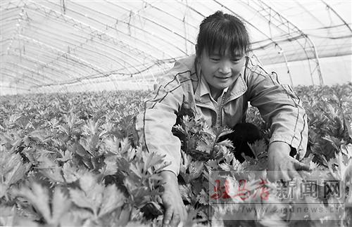 一個大棚、一畝多地、兩萬多斤芹菜就可以賣兩萬多元。陳小燕是驛城區水屯鎮劉付漢村村民,像她這樣種植溫棚蔬菜的農民全鎮有4000多人。圖為陳小燕在大棚內采摘新鮮蔬菜。 記者 吳 波 攝