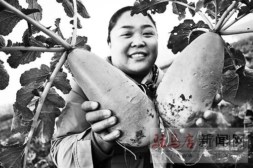 昨天下午,在驛城區順河辦事處順河村張井蘭承包的10多畝蔬菜園內,水果蘿卜正處于收獲階段。