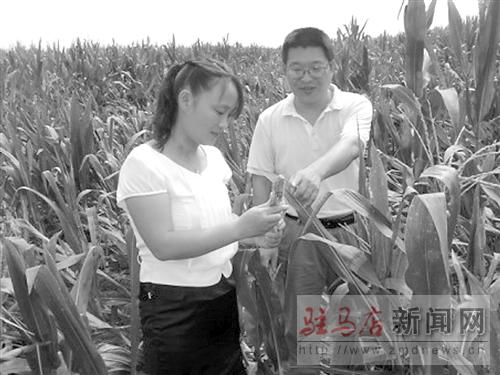 近期,由于強降雨、大風等惡劣天氣,導致驛城區夏播玉米部分倒伏,并發生了嚴重的蟋蟀危害現象。為此,農業專家提醒農民可采取每畝用40%甲基異柳磷乳油15毫升~20毫升,拌麥麩2.5公斤于傍晚堆施田間,減少對玉米的危害。圖為農業專家在察看玉米受災情況。 記者 鄭付生 通訊員 曹 然 攝影報道