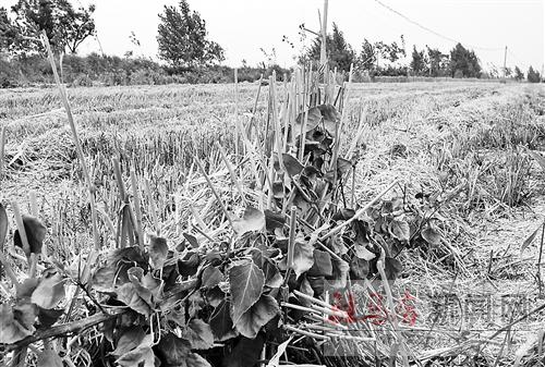 這樣的麥田有4塊,其中一塊麥子已經收割完畢。在一塊空地上,有一棵楊樹沒來得及拉走,樹枝上還掛著一片片綠葉(如圖)。