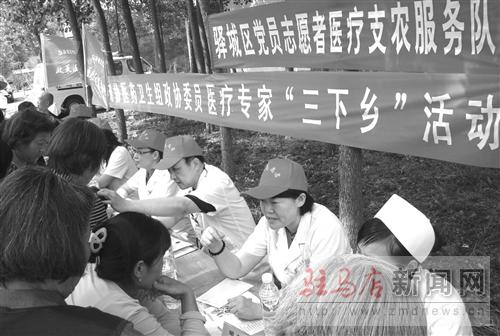 日前,驛城區(qū)充分發(fā)揮黨員服務(wù)中心三級服務(wù)網(wǎng)絡(luò)的優(yōu)勢,開展送醫(yī)療衛(wèi)生、送農(nóng)業(yè)科技、送政策法規(guī)“三下鄉(xiāng)”服務(wù)活動。黨員志愿者先后深入到胡廟、水屯、諸市等鄉(xiāng)鎮(zhèn)為居民服務(wù)。圖為志愿者義診服務(wù)現(xiàn)場。