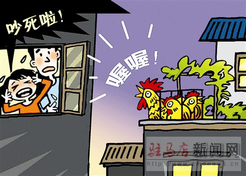 兩個多月來,每天凌晨,家住福州市鼓樓區某小區的街坊,就會被幾只大公雞準時叫醒。該小區有一租戶在陽臺上養了一群雞。日前,在街坊的投訴下,社區民警介入,責令該租戶在3天內將雞移走。(據《海峽都市報》)