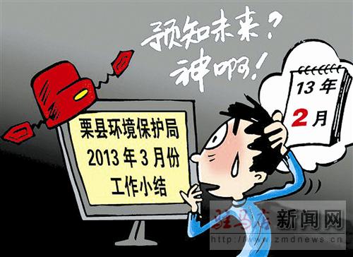 摘要: □春 鳴 2月26日,網(wǎng)友在萍鄉(xiāng)市上栗縣人民政府官網(wǎng)上,發(fā)現(xiàn)上栗縣環(huán)境保護(hù)局2013年3月份上半月工作小結(jié)。不少網(wǎng)友戲言政府部門有“預(yù)知未來神一樣的能力”。上栗縣環(huán)境保護(hù)局稱,是工作人員誤將去