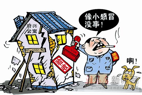近日,海南省海口市瓊山區安置房府興公寓的業主們反映,安置房存在“偷工減料”現象,多家房屋的天花板、地板出現不同程度開裂。對此,海口市建設工程質量安全監督站分管驗收的副站長吳坤順卻語出驚人:“驗收只是程序和形式,哪能逐個抽查?這種情況(開裂)好比人感冒了,就不能說人不行。”(據法制網)