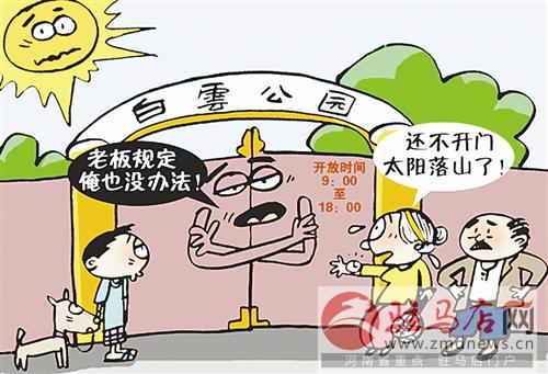 廣州市白云公園自今年2月建成開放后,周圍許多居民都愿意進去游玩。但這個公園似乎“架子”很大,太陽老高了,它卻遲遲不開門,下午太陽沒落山,它又早早閉園了,這讓周圍居民大為不滿。原來,該公園開放時間為早9時至晚6時,而其他公園開門時間為早6時至晚9時。