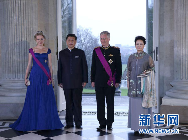 3月31日晚,比利時國王菲利普在布魯塞爾拉肯宮舉行隆重國宴歡迎國家主席習近平到訪。習近平和夫人彭麗媛抵達時,受到菲利普國王和瑪蒂爾德王后熱情迎接。 新華社記者 龐興雷 攝