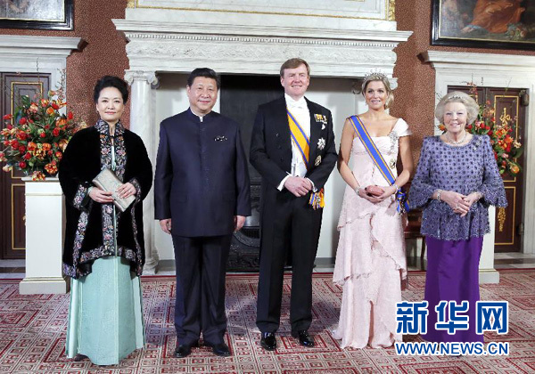 3月22日,國家主席習近平在阿姆斯特丹會見荷蘭國王威廉-亞歷山大。當晚,威廉-亞歷山大國王在王宮為習近平舉行盛大國宴。威廉-亞歷山大國王、馬克西瑪王后、貝婭特麗克絲前女王共同迎接習近平和夫人彭麗媛到來。新華社記者鞠鵬攝
