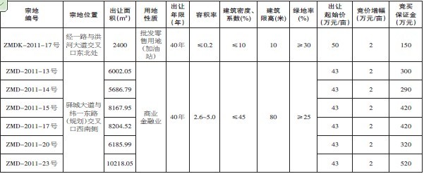 摘要: 駐國(guó)土告字[2011]19號(hào) 經(jīng)駐馬店市人民政府批準(zhǔn),駐馬店市國(guó)土資源局決定公開(kāi)競(jìng)價(jià)出讓ZMDK-2011-17號(hào)等七宗國(guó)有建設(shè)用地使用權(quán)。現(xiàn)將有關(guān)事宜公告如下: 一、公開(kāi)出讓宗地的基本情況和規(guī)劃指標(biāo):(宗地