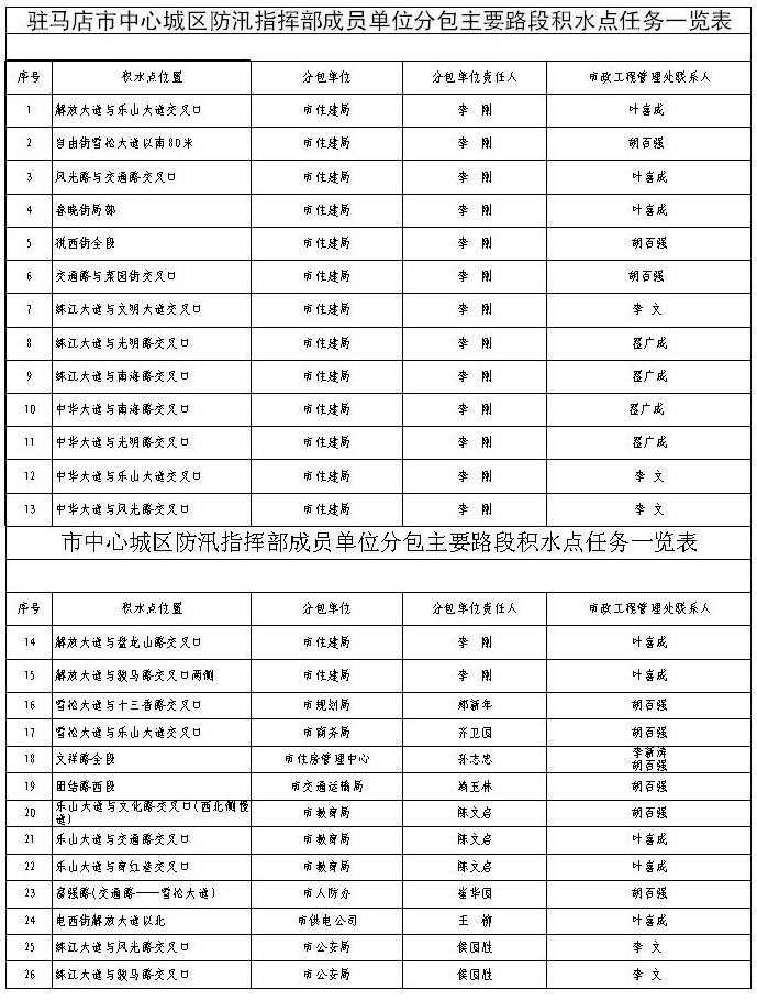 駐馬店市中心城區防汛指揮部成員單位分包主要路段積水點任務一覽表