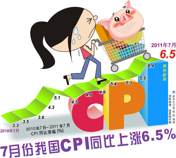 最近一個時期,通貨膨脹的陰影籠罩全球,許多國家都面臨物價上漲的壓力與挑戰。在我國,從2010年下半年開始,居民消費價格指數不斷攀升,物價問題一時間成為人們關注的熱點。據國家統計局提供的報告,去年三季度消費價格指數同比上漲3.5%,四季度為4.7%。今年一季度的數字為5.0%,4月份為5.3%,5月份為5.5%,6月份達到6.4%,7月份則為6.5%。“從去年底到今年7月,一斤豬肉漲了8塊錢,一斤雞蛋漲了1塊多。”北京市一位退休教師感覺到“菜籃子”的負擔越來越重。