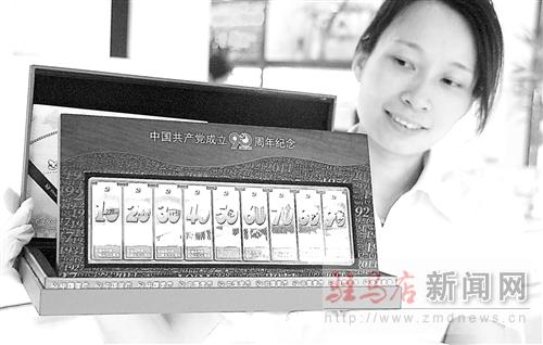 近日,市金鑫珠寶金店推出中國共產黨建黨90周年系列貴金屬收藏品,由于限量發行和歷史題材意義重大,一上市便得到我市收藏愛好者及投資商的熱捧。圖為該店員工正在展示建黨90周年題材的金、銀條收藏品。 記者 李小龍 攝
