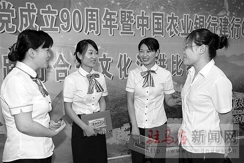 近日,農(nóng)行駐馬店分行舉辦了慶祝中國(guó)共產(chǎn)黨成立90周年暨中國(guó)農(nóng)業(yè)銀行建行60周年踐行合規(guī)文化演講比賽,來(lái)自基層單位18位選手參加了演講比賽。圖為獲獎(jiǎng)選手在一起交流學(xué)習(xí)經(jīng)驗(yàn)。通訊員 鄧國(guó)勇 攝