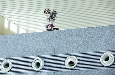 進入南京南站三樓候車大廳,您的左手邊是哈根達斯、真功夫、面包物語等“小吃店”,您的右手邊是一些南京特產的展賣臺。您左前方的“半層”上是“小吃街”;右前方的“半層”是仿照秦淮古建筑的“食品、用品街”。此外,記者還在每個檢票臺和每個柱子上面,都發現一個像“機器人瓦力”一樣的東西。車站的工作人員介紹,這是泡沫滅火器。這種電動防爆型高倍數泡沫發生器鼓風壓頭,可輸送泡沫達三百米遠,適用于撲救倉庫,大型煤礦、地下商場等大面積火災,“失火的時候,它會‘啪嗒啪嗒’地不斷往外噴滅火物質。”