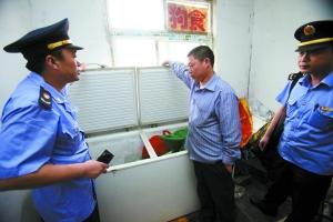 昨日,執法人員查抄過期火腿腸。針對本報報道的“大興舊宮鎮一市場有商販長期售賣過期火腿腸”,當日大興工商部門與多部門聯合執法,在該商販處查扣各式火腿腸、熟肉制品及生肉等過期食品180公斤。工商部門表示,此案已移轉公安部門。商販稱部分過期食品來自超市配送中心和冷庫,據記者調查,其所售的過期產品中,很大一部分是“金鑼”牌的香腸,其中有3家配送中心為“金鑼”的經銷商。據悉,配送中心所涉及的幾個區工商部門已介入調查。本報記者 王貴彬 攝