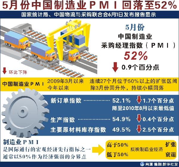 圖表:5月份中國制造業PMI回落至52% 新華社發