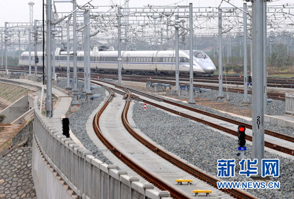 5月11日,一列試運行的動車組列車行駛在京滬高鐵南京南站軌道上。當日,京滬高速鐵路在基本完成聯調聯試的基礎上,開始進入運行試驗階段,作為京滬高鐵五大樞紐站之一的南京南站迎來一趟趟試運行的“和諧號”CRH380A型動車。根據鐵道部統一安排,從5月11日起,京滬高鐵全線將按照實際列車運行圖,用一個月左右的時間進行運行圖參數測試、故障模擬和應急演練等在內的運行試驗。新華社記者孫參攝