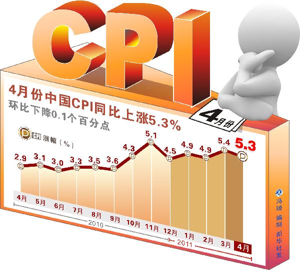 國(guó)家統(tǒng)計(jì)局11日公布了4月份的宏觀經(jīng)濟(jì)數(shù)據(jù),市場(chǎng)焦點(diǎn)再次聚焦在CPI(居民消費(fèi)價(jià)格指數(shù))數(shù)據(jù)上。從數(shù)據(jù)看,4月份我國(guó)CPI同比上漲5.3%,漲幅比3月份回落0.1個(gè)百分點(diǎn)。這是今年CPI連續(xù)第二次“破5”,其中食品價(jià)格上漲11.5%,非食品價(jià)格上漲2.7%,消費(fèi)品價(jià)格上漲5.9%,服務(wù)項(xiàng)目?jī)r(jià)格上漲3.9%。居民消費(fèi)價(jià)格繼續(xù)高位運(yùn)行。