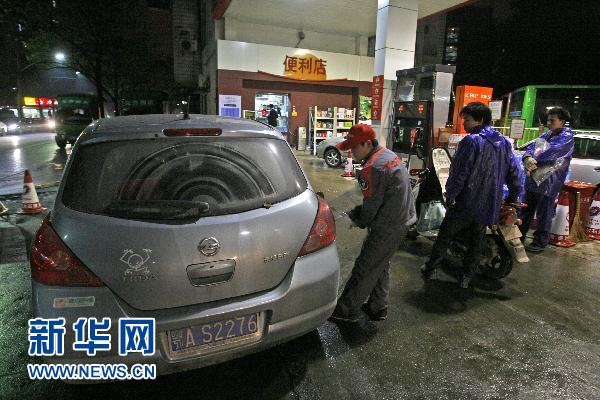4月6日晚,在武漢漢口的一個加油站,工作人員準備為車輛加油。新華社發(fā)