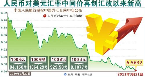 摘要: 3月21日,來自中國外匯交易中心的最新數(shù)據(jù)顯示,人民幣對美元匯率中間價報6.5632,較前一交易日上漲36個基點。人民幣匯率再創(chuàng)匯改以來新高?! ≈袊嗣胥y行授權(quán)中國外匯交易中心公布,2011年3月21日銀行