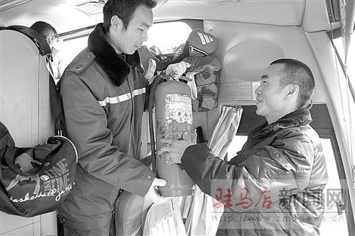 隨著春節長假結束,返程旅客逐漸增多。為應對客運高峰的到來,維護良好客運秩序,平輿縣運管部門從危險品查堵、車輛安檢、從業資格、客車出站等環節強化源頭安全管理,嚴格落實汽車客運站“三不進站,五不出站”的管理規定,確保廣大旅客行車安全。圖為運管人員在檢查客運車上滅火裝置。通訊員 李亞超 攝