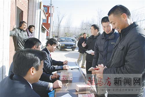 為滿足農民群眾對抗旱資金的需求,汝南縣農聯社及時組織信貸人員走村串戶為農民辦理貸款手續、發放貸款。圖為信貸人員為農民發放貸款。通訊員 楊建國 攝
