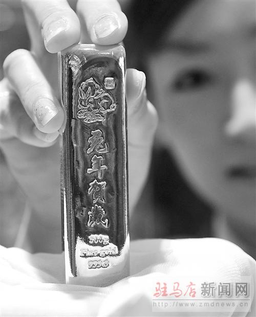 近日,北京菜百商場的工作人員展示兔年賀歲金條。當天,由中國金幣總公司限量發行的“2011(辛卯)兔年賀歲”金條在京首發。該款金條是繼2003(癸未)羊年賀歲金條后連續發售的第九組金條,全國發行總重量為3.98噸。 新華社發