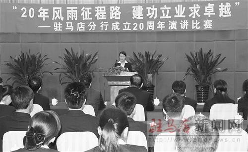 為迎接中行駐馬店分行20年行慶,展示20年來取得的驕人業績,激發員工愛行敬業的熱情,近日,中行駐馬店分行舉行“20年風雨征程路,建功立業求卓越”演講比賽。圖為演講比賽現場。通訊員 王 欣 段國清 攝影報道