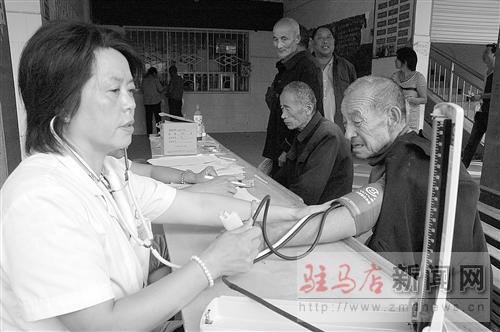 摘要: 9月21日,確山縣劉店鎮衛生院的醫生正在為一名67歲的老人量血壓。據了解,為切實保障65歲以上的老年人安度晚年和促進0~6歲兒童健康成長,該鎮衛生院專門組成一個醫療檢查小組,從9月15日起為全鎮65歲以