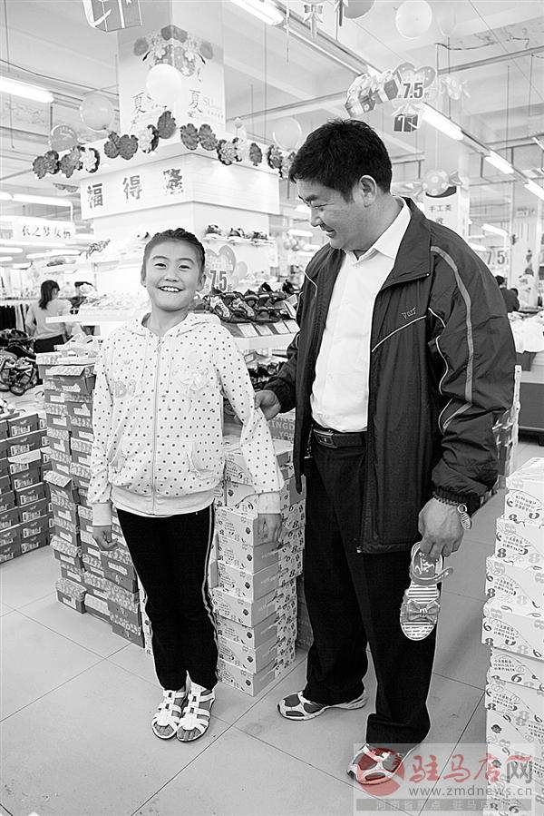一名女孩在開心地試穿爸爸為她選購的漂亮涼鞋。
