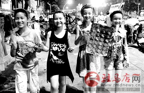 過了一會兒,幾個擺攤的孩子主動出擊,去旁邊的夜市攤向市民推銷商品,效果也不錯。“每天能賣十元錢。”宋媛媛說,她在這里干了一個星期。