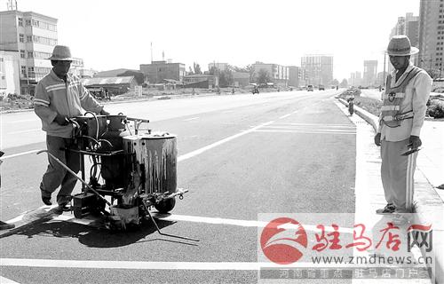 8月7日上午,身穿橘紅色衣服的施工人員正在市雪松大道西段畫交通標線。
