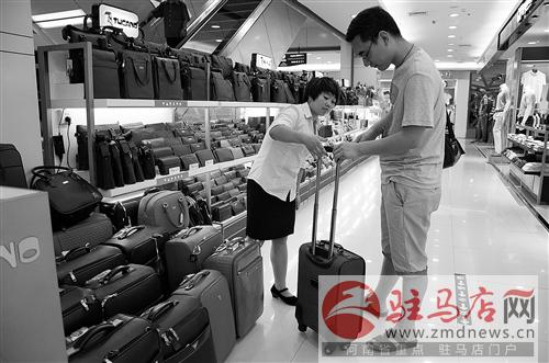 近日,在市區樂山商場,一位顧客在購買箱包。顧客介紹,他是為家中剛考上高校的學生購買的。連日來,隨著大學新生報到臨近,家長紛紛為子女購買出行必備的箱包、旅行包。市區有的商家還憑大學錄取通知書為顧客打折,吸引了不少家長。記者 張 朝 攝