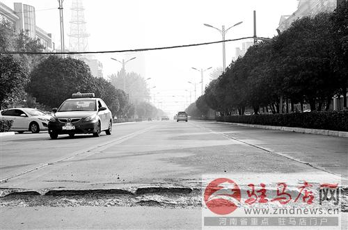 昨日,在市解放大道西段駐馬店市一高西區附近,記者看到機動車道上有一段長約1.5米的路面破損嚴重,最深處有5厘米。市民開車途經此處,不是匆忙換道,就是緊急減速。“解放大道是市區主干道之一,車流量較大,如果前面的車突然換道或剎車,很容易發生意外。”看到記者拍照,途經此處的市民郭恒睿說。