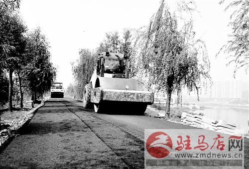 昨日上午,施工人員正在駐馬店練江河濱河公園南岸河堤道路鋪設水泥穩定碎石層。