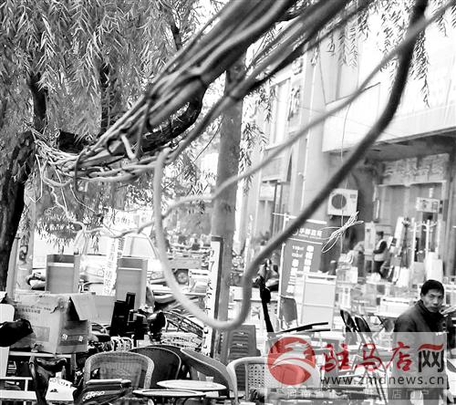 昨日,記者在該家屬院大門口發(fā)現(xiàn),進出家屬院的車輛和行人很多,電纜垂落下來,懸在半空中,最低處距離地面不足1米,比旁邊的垂柳枝還低。記者數(shù)了一下垂落的電纜,有11根。附近一商鋪老板張先生告訴記者,他曾給通信、有線電視等多家單位反映,他們都說不歸自己管。