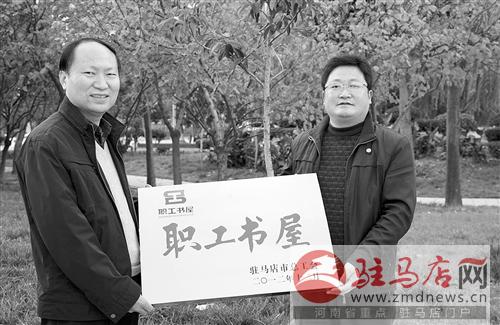 市總工會(huì)在文明單位結(jié)對(duì)幫扶活動(dòng)中,把農(nóng)民工素質(zhì)教育納入幫扶活動(dòng)內(nèi)容。近日,市總工會(huì)出資一萬(wàn)多元為平輿縣尹灣村建立了農(nóng)民工書屋,豐富村民的業(yè)余文化生活。圖為市總工會(huì)有關(guān)負(fù)責(zé)人為該村第一黨支部書記閆建偉頒發(fā)職工書屋牌匾。 通訊員 郭東升 攝